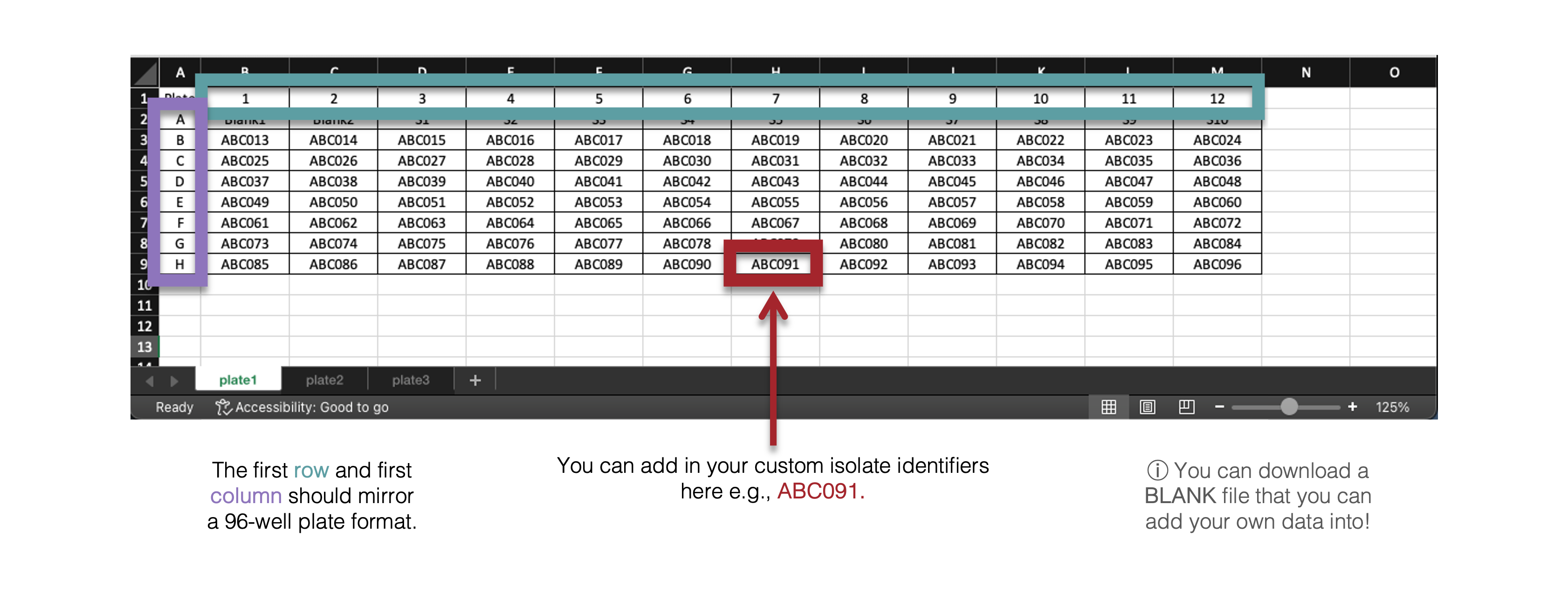 The plate layout file should contain all of the plate layouts in each tab. For each 96-well plate that you run on the Luminex machine, prepare a plate layout that includes the sample labels that will match your raw data. The application will match the raw data to the corresponding sample based on the plate layout that you import.