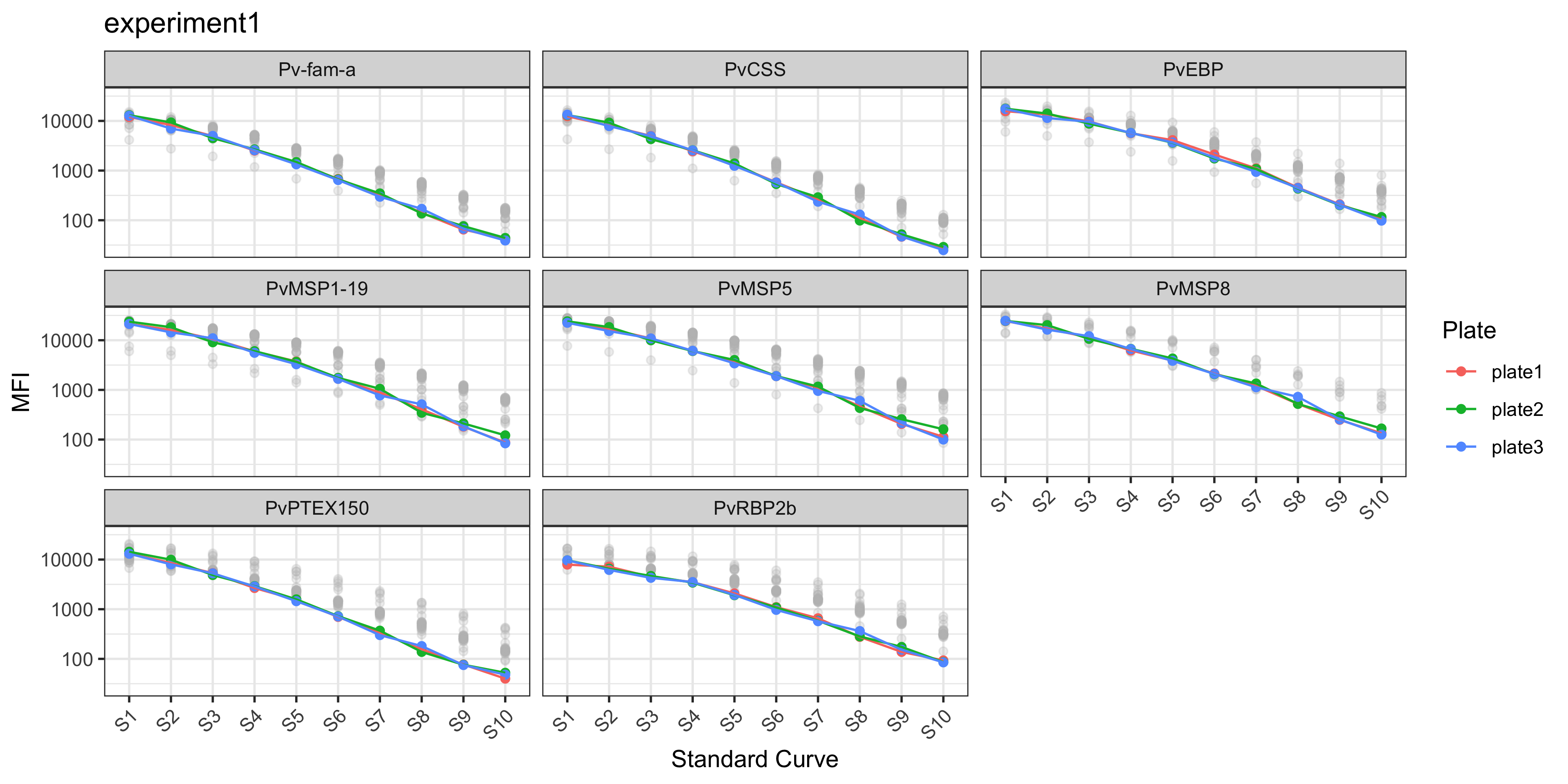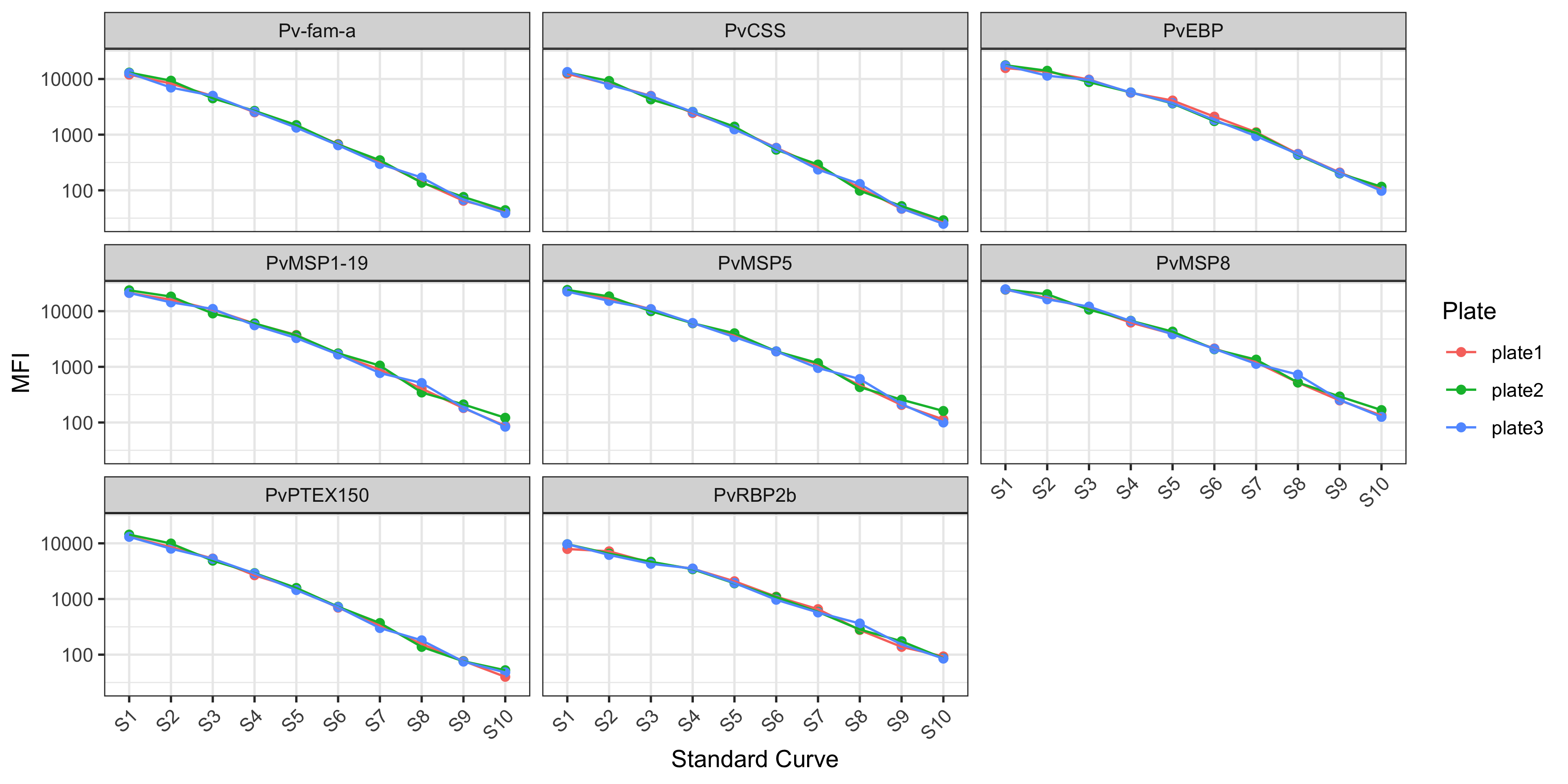 In the case of the PvSeroTAT multi-antigen panel, the antigens will be displayed and in general your standard curves should look relatively linear (only when the y-axis is on log-adjusted scale).